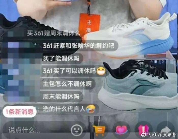 事情发酵后,刚跟她签约的运动品牌361°,直播间直接被愤怒的网友冲了。大家都在刷屏:“买你们的鞋能调休吗?”“穿上361,同事在我脚下。”面对汹涌的舆情,361°的反应可以说非常迅速。9月3日,品牌方就宣布,“基于双方发展路径的调整”,与张水华的合作暂告一段落。