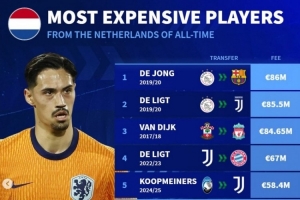 体育资讯6月11日讯 曼城官宣赖因德斯加盟,固定转会费5500万欧。据德转数据统计,赖因德斯转会费在荷兰球员转会费中排在第6。